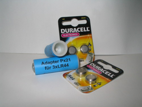 Für die z.T. nicht mehr lieferbaren 4,5 Voltbatterien PX 21 hatten wir einen Batterieadapter hergestellt welcher mit 3 Stück LR 44 bestückt wird .